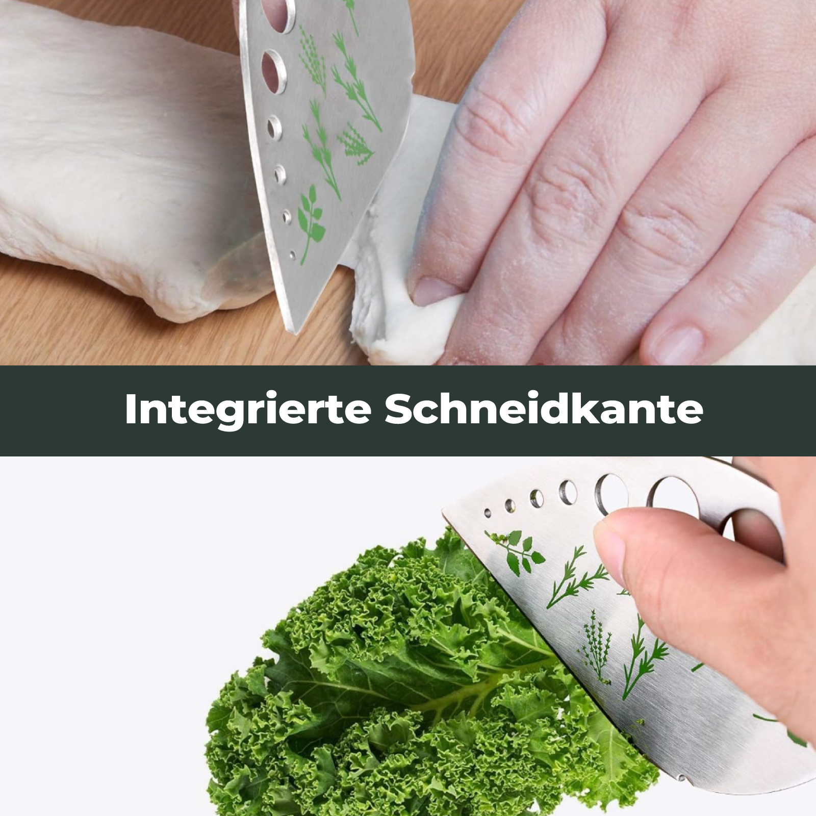 Kräuter direkt nach dem Entstielen fein hacken – ohne zusätzliches Messer.